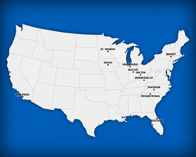 The Pioneer Football League is a truly national conference with members on each coast and throughout the nation’s heartland. Butler University, the University of Dayton, Drake University, and Valparaiso University were among the league’s founding members in 1993, with Davidson College, Marist College, Morehead State University, Presbyterian College, the University of San Diego, the University of St. Thomas, and Stetson University joining to form the current 11-team league.